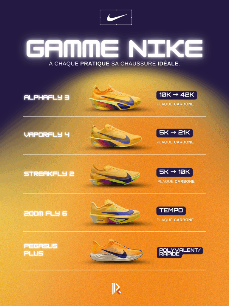 Dans ces chaussures, on retrouve des modèles avec et sans plaque, plus ou moins dynamiques, adaptés à différentes distances et composés de diverses mousses.