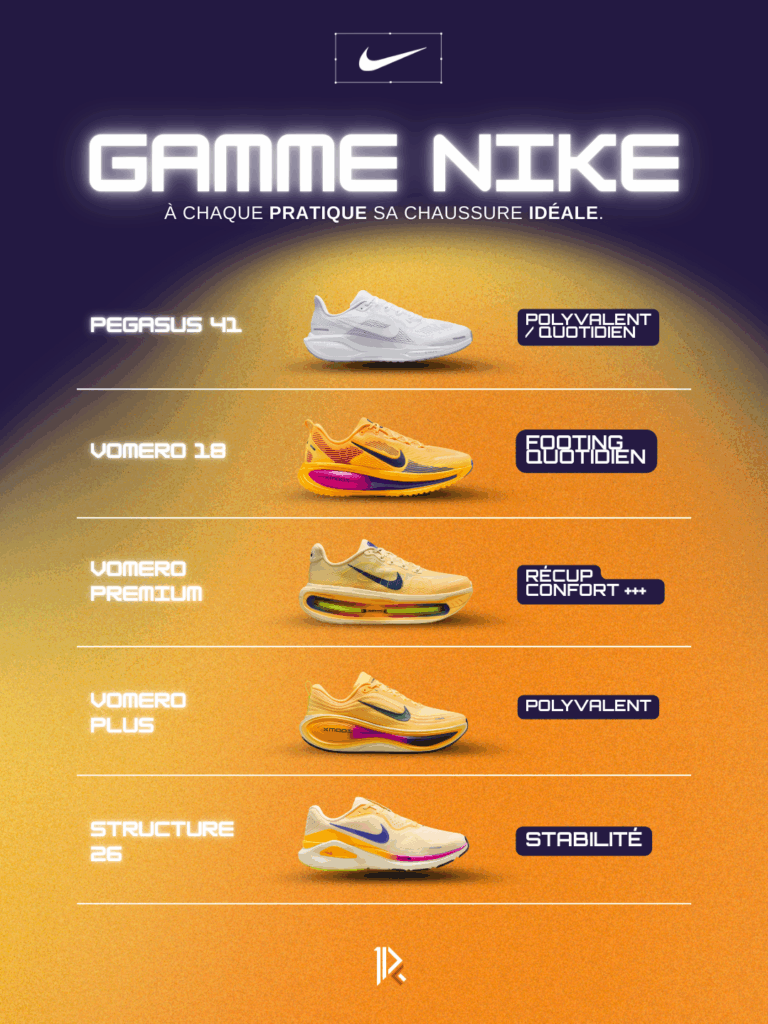 Depuis peu, Nike a clarifié sa gamme de modèles d’entraînements et on s’y retrouve beaucoup mieux ! Le concept est simple : une base de 3 modèles (Structure, Pegasus, Vomero) déclinés en 3 variantes (Classique, Plus, Premium). La version « plus » se veut plus dynamique que l’originale, tandis que la « premium » se veut plus maximaliste avec des unités Air Zoom en plus.