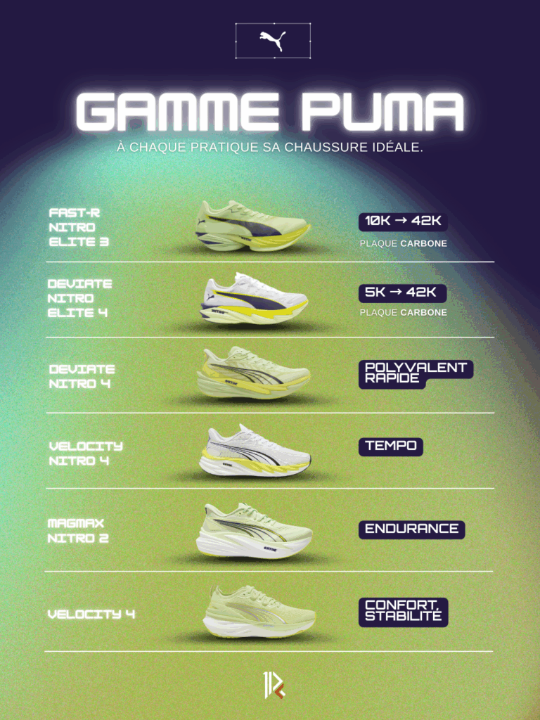 Que ce soit pour l’entraînement rapide, le tempo ou la compétition du 5km au marathon, Puma propose aujourd’hui des modèles capables de rivaliser avec les références du marché.