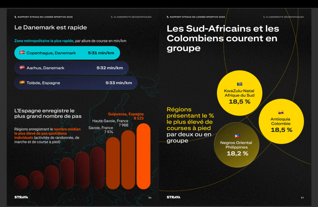 Les Français brillent différemment sur Strava, faisant de l’Hexagone un véritable camp de base pour la communauté des coureurs réguliers. La Haute-Savoie et la Savoie se hissent respectivement aux 2ᵉ et 3ᵉ places mondiales du nombre de pas quotidiens, avec près de 8 000 pas par jour en moyenne. Cette performance témoigne d’une pratique française axée sur la régularité et le volume d’activité plutôt que sur la vitesse pure.